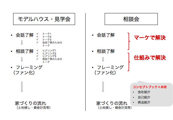 具体的な家づくりのお話をするためには、相談了解、フレーミングにおける「会社案内」と「自己紹介」が必要不可欠です。暮らしを提案するにたるべく人になるためには、営業技術、商品説明、次アポトークの前に、会社と自分によるファン化が必要不可欠です。