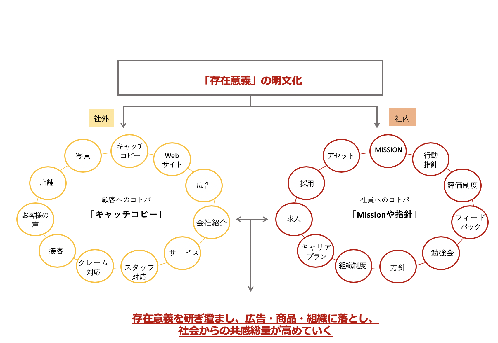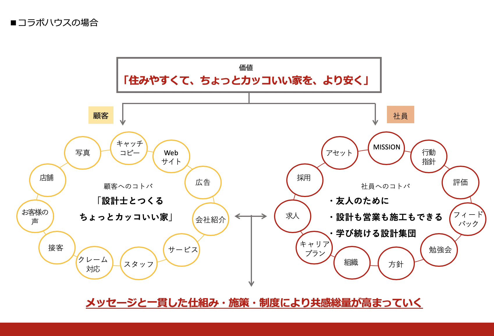 写真、キャッチコピー、広告、WEBサイト、商品、接客、スタジオ、提案、設計、施工、アフターといった外部戦略。採用、育成、評価、Mission、行動指針、キャリアプラン、組織制度といった内部戦略。どれも自社の存在意義から始まります。広告や集客、商品、採用、育成を見直す前に、ブランドコアを研ぎ澄ますことが、企業の発展性を左右します。