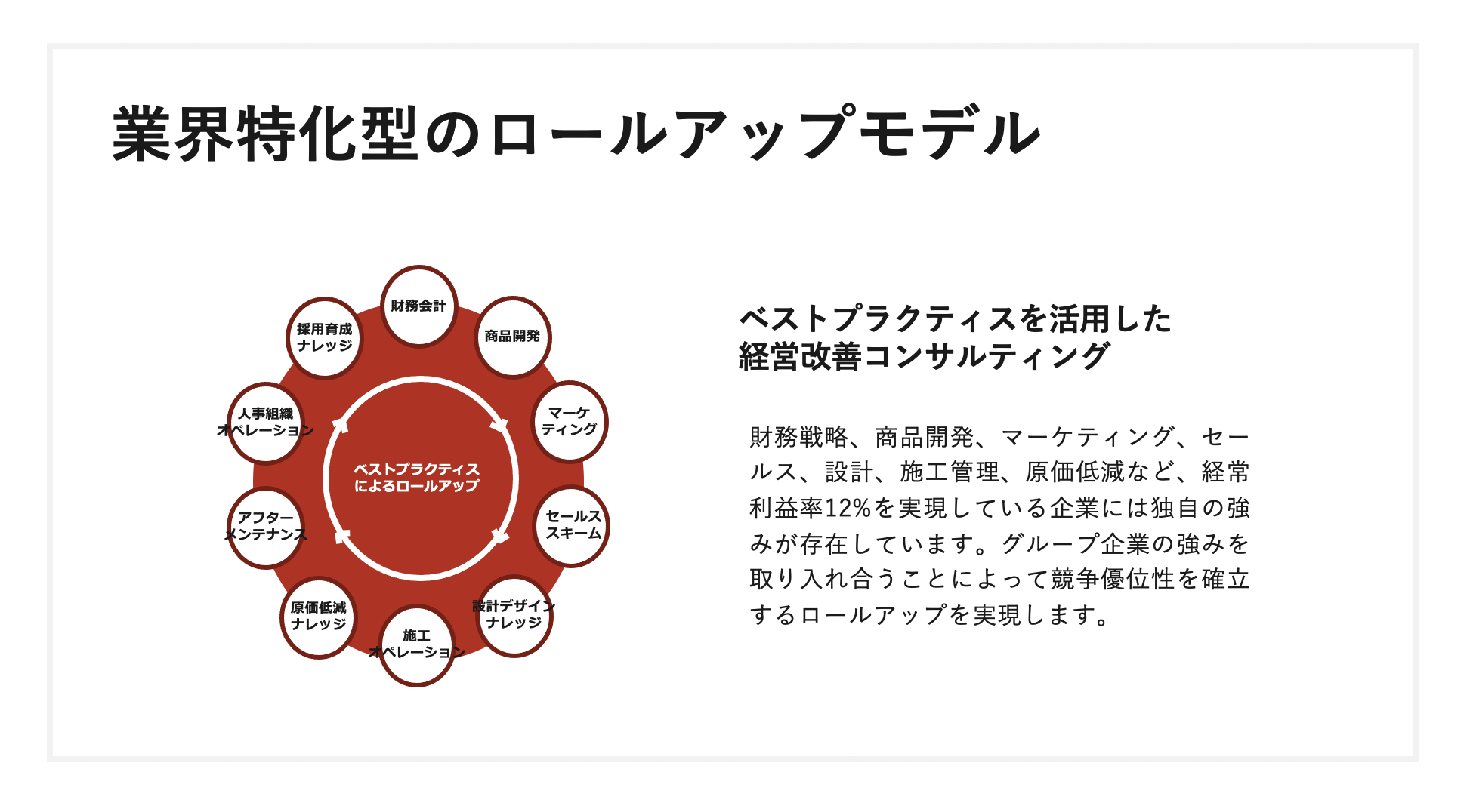日本企業381万社のうち、99.7%にあたる379.8万社が中小企業です。そのうち約12%を占める47万社が中小規模の住宅建築会社であり、その市場規模は10兆円規模となっています。このうち、3社に1社は後継者不在となっていて、地域の暮らしを支える住宅会社、建設会社にとっては大きな課題となっています。一方で、そのような状況下から、ホールディングス経営やロールアップにより、事業承継を成功させる住宅会社さん、建設会社さんのクライアント事例が増えてきました。
