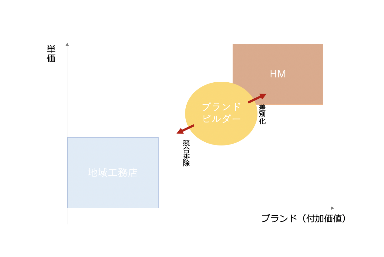 多くの住宅会社がチカラを付け、デザイン力、性能、金額の差が埋まり、同質化されてきています。この中で、デザイン力が弱い会社は集客で苦労しますし、商品力(仕様 性能 付加価値)が弱ければ見積りや契約で苦労することになります。一方で、そこそこ実力がついても、同質化した市場によって「金額」や「セールスロジック」、「広告量」による競争が激しくなっており、なかなか利益を出しにくい環境になっている。というのが全国的な傾向です。ですから、私たちは、性能・デザイン・付加価値を持ってハウスメーカーと2500~3000万円ゾーンで勝負するためのリポジショニングを推奨しています。これがブランドビルダーになるためのポジショニングとなります。