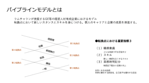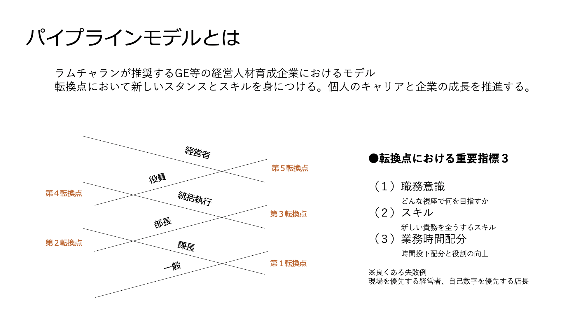 これは、営業、課長、部長、事業部長、事業統括役員、経営者へと、段階を経てリーダーとして成長していくなかで、通過する転換点とそこで直面する問題を明らかにし、転換点のハードルを越えるための可視化である。(ウォルマーラー提唱のキャリアクロスロード、ラムチャラン提唱のパイプラインモデル参照)