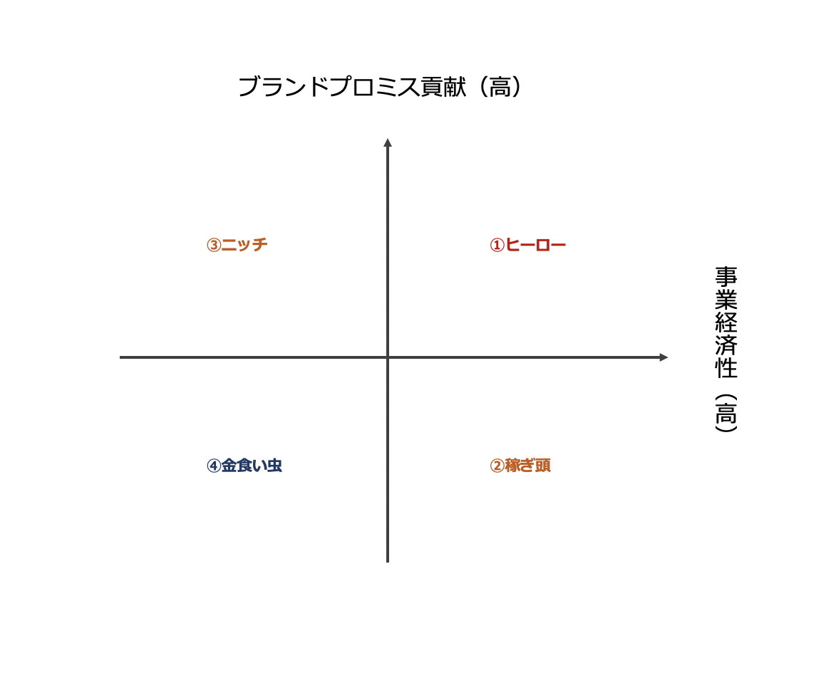 ブランドストレッチ、事業多角化を遂行していく上で、以下のマトリクスが重要になります。ブランドプロミスに貢献し、かつ事業経済性の高い事業を手がけていかねば、新事業・新ブランドは企業の収益性とブランドを既存していくことになります。