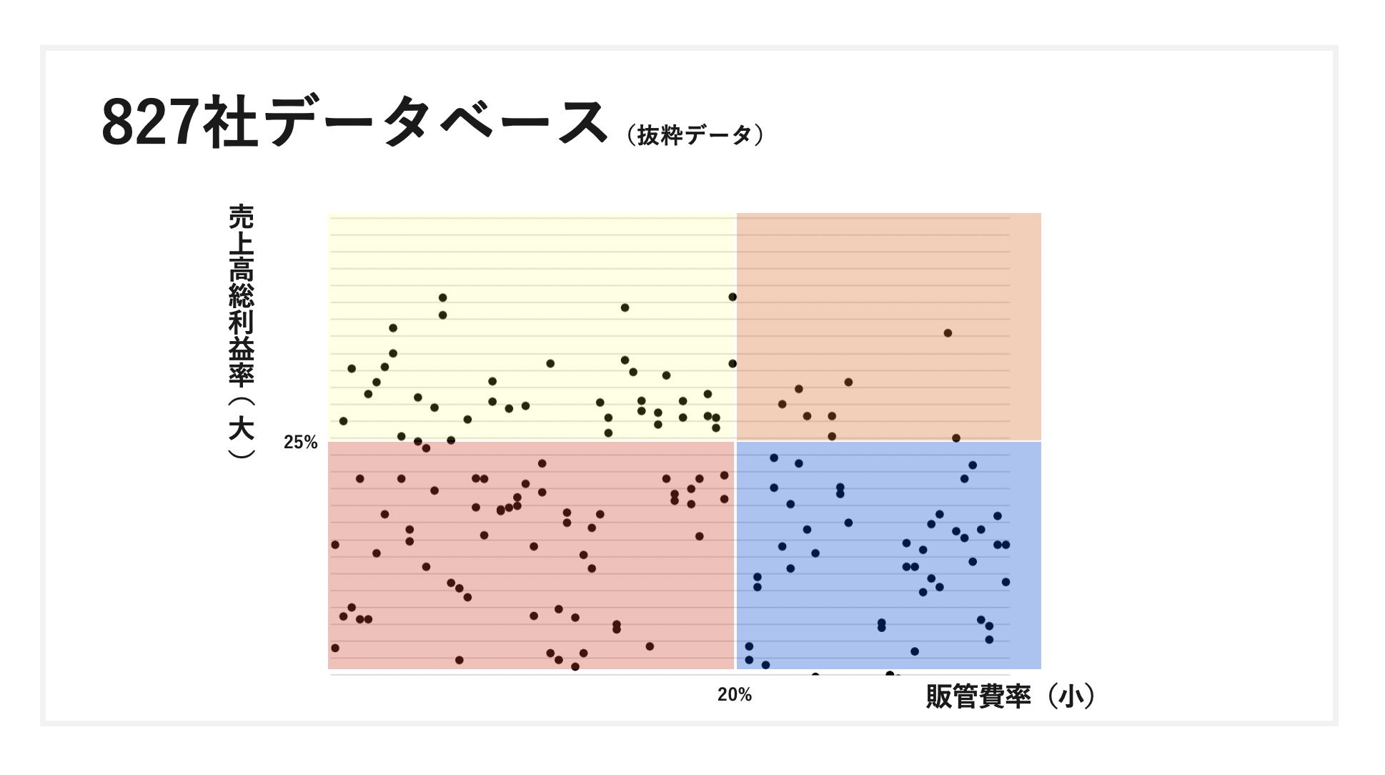 それは、売上高総利益率の高い会社は、販管費率が高い。逆に、売上高総利益率の低い会社は、販管費率が低い。という相関関係です。これは、経営者の怠慢を表しており、理想的には売上高総利益率を高めながら、販管費率を削減していくことが必要です。要するに、付加価値を高め、生産性を高めること。