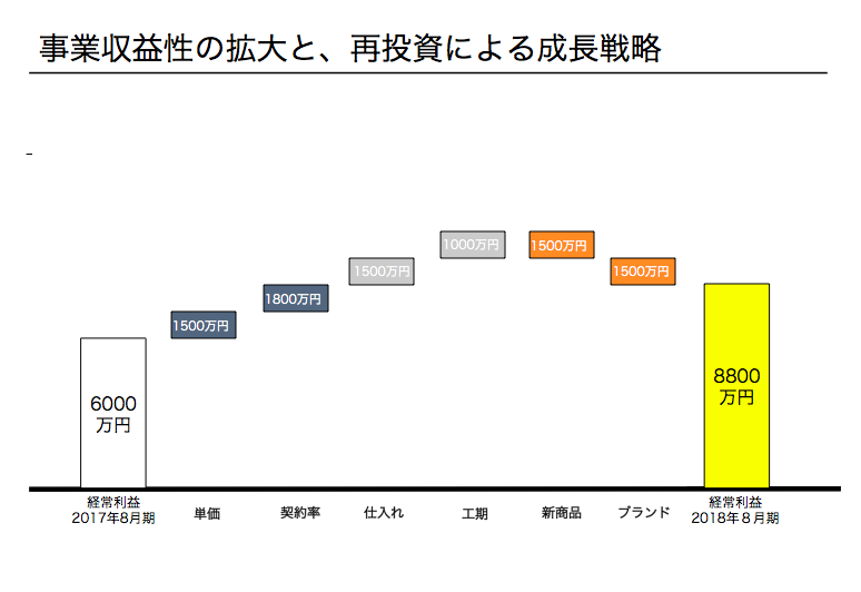 実際の経営数字を公開させていただきますと、スライドのような経営改善を実施できました。しっかりと攻め(広告、営業)と守り(原価、工事)により利益創出できる力を養いながら、競争優位性を確立し、サスティナブルな企業成長への再投資戦略を実施。また、経常利益を増加し、純利益を厚くしております。