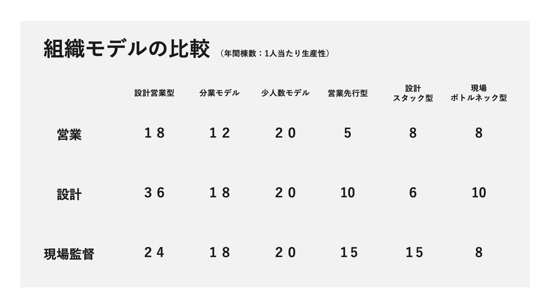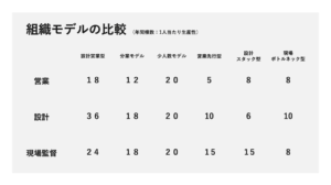 営業と設計は分業しているが、ユニット制のためリンゲルマン効果を防止することができる。営業12棟/年、設計18棟/年の基本オペレーションがあるため、組織全体の生産性が高い。
