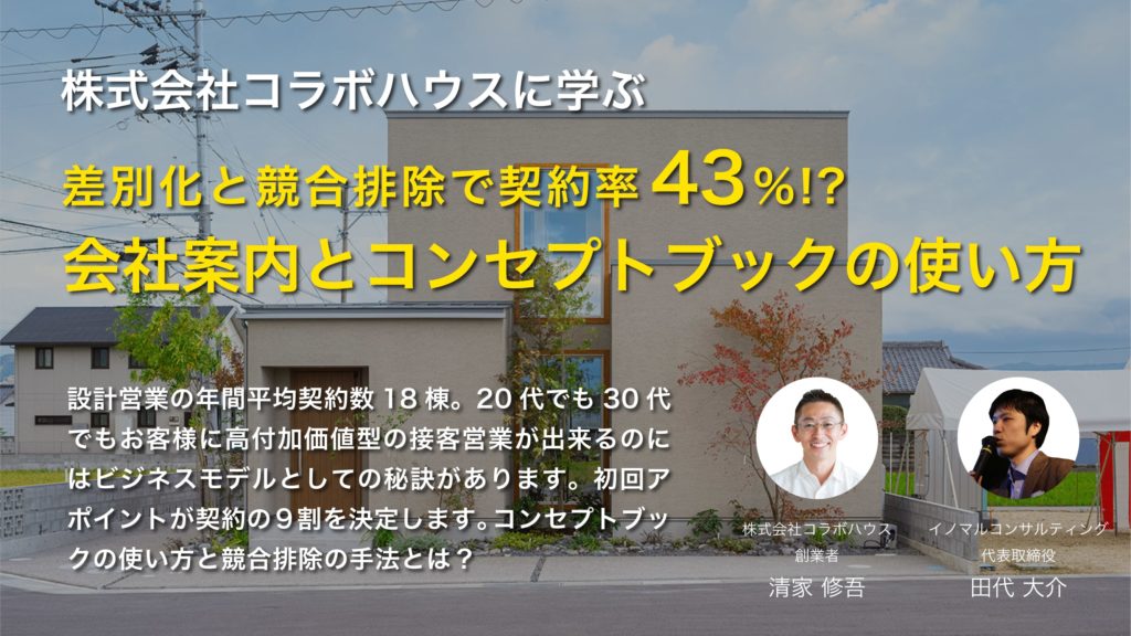 競合他社とどのように差別化するのか?どのように競合排除をするのか?中途営業マンの能力に依存せず、企業として競争を排する「営業戦略」が必要不可欠です。年間契約数が1人当たり18棟を越えるコラボハウス一級建築士事務所によるコンセプトブックの使い方と考え方を公開。自社の強みや特徴をお客様にお伝えすることで、企業全体の契約率と契約数を向上します。