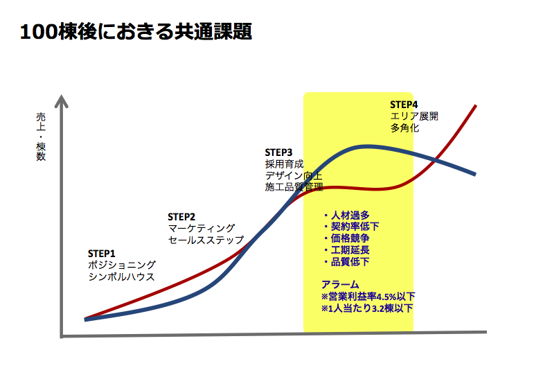 全国のビルダー経営者の方から、「年間契約100棟を越えたのだが、問題を抱えている」というご相談を多くいただきます。その内容は、「デザインの陳腐化」、「人が増えたが1人当たりの生産性が低い」、「施工で工期やクレームの問題が増えた」、「会社全体の契約率が落ちてきた」などというものです。