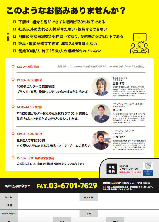それは、大手ハウスメーカーと戦わないブランドビルダーになるためです。縮小する住宅市場においては、少数精鋭でも年間30棟を目指さなければ、生き残ることはできません。社長不在でも売れる!ブランドと組織とは?求職者、優秀なスタッフ、お客様から選ばれるブランドの作り方をご紹介致します。