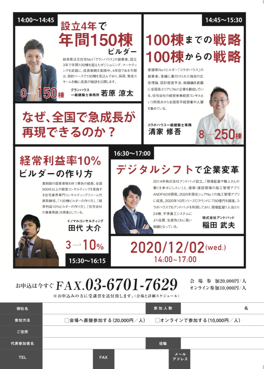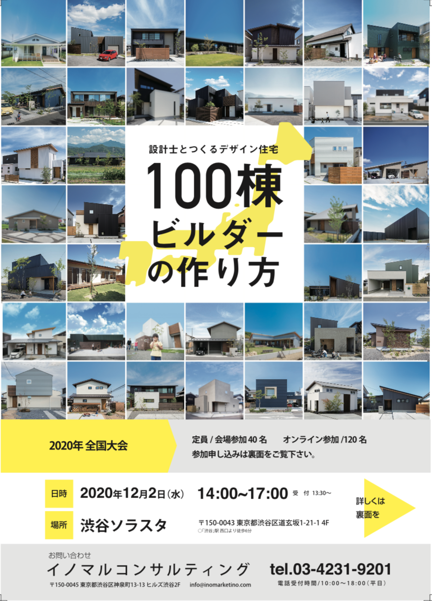 ネットワーク加盟企業様、クライアント企業様、過去セミナー参加企業様、まだ会ったことはないけれどご興味の企業様、ぜひこの機会にご参加いただけますと幸いです。毎年100名以上のビルダー経営者様にご参加いただいております。本年は、オンライン併用の開催とさせていただきます。
