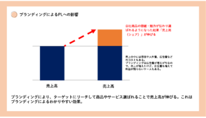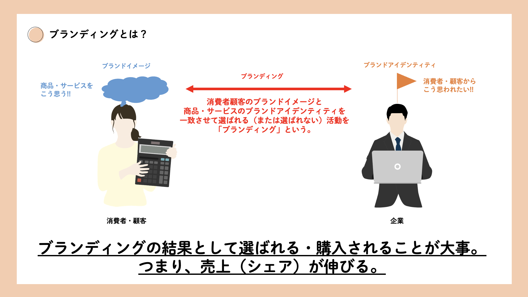 ブランディングは「自分たちが消費者に『こう思われたい』というブランドアイデンティティ」と「消費者が商品やサービスについて『こう思う』というブランドイメージ」を一致させて、ターゲットとする消費者から選ばれるための活動のことです。つまりブランディングの結果として“選ばられる”ことが重要であり、選ばれるということは売上(シェア)が伸びることにつながります。