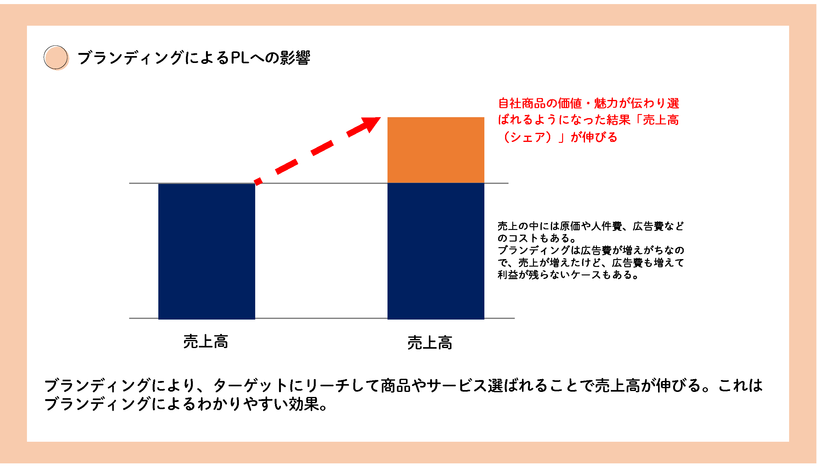 それでは、「売上が伸びればブランディングは成功なのか」と聞かれたらどうでしょうか。答えはNoです。事業活動をしている以上、売上の先にある利益にこだわらなければいけません。ブランディングにより売上が伸びた場合、売上の伸びに対してコストが抑えられていれば、得られる利益は増えます。しかし、ブランディングはコミュニケーションに多くのコストを使う場合があります(CMをはじめとした広告・販促)。売上は伸びたけど、その分コストもかかったでは意味がありません。よく、コミュニケーションとしてブランディングはできたけど、会社の利益に繋がらなかったよね。となるのはこういったケースが多いです。