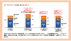 ちなみに、地域を代表するブランドビルダーになるためには「①付加価値型モデル(ブランド戦略)」を取ることが王道です。付加価値型モデルを取った場合でも、一定以上の利益確保のためには、原価削減や生産性向上にも取り組むことになるため、原価率・販管費率も下がります。
