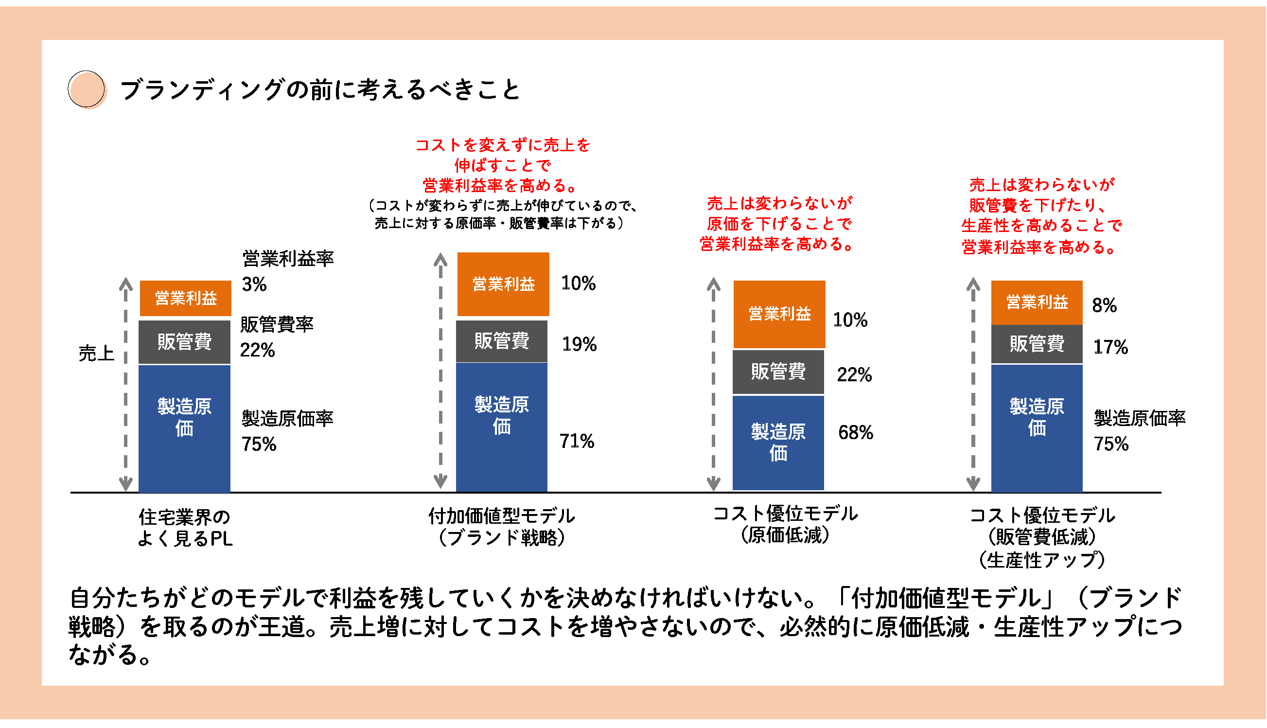 ブランディングに取り組む前に考えなければいけないのは、どの経営数字にブランディングの効果を効かせるかです。利益=売上ーコストですから、売上を伸ばすか、コストを下げるかのどちらかです。そのかで工務店が取るべき戦略は3つあります。