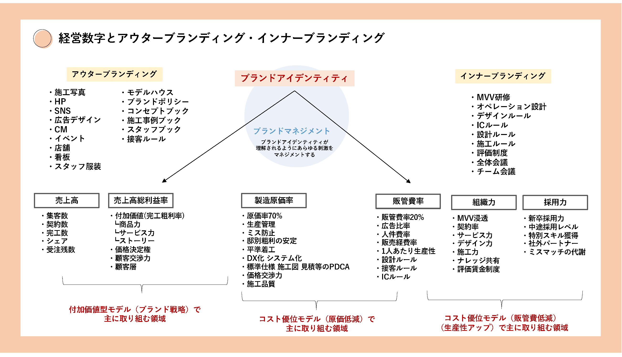 どの戦略を取るかが決まったら後は具体的な行動あるのみです。ブランディングには大きく分けて「アウターブランディング」と「インナーブランディング」があります。アウターブランディングは、CMやWebサイトなど消費者や社会に対してのアクションになり、主に付加価値を高めるために取り組むべき内容になります。一方インナーブランディングは、ミッション・ビジョン浸透や営業フローの整備、仕様打ち合わせ回数の徹底、邸別粗利のチェックなど、コストを優位にするために取り組むべき内容になります。どちらか一方だけではアンバランスになるので、どちらもバランスよく取り組むことが重要です。