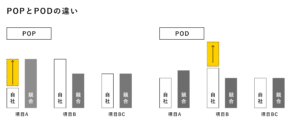 性能・デザイン・コストの時代になり、まず平均点以下の会社は選ばれません。写真をパッと見ていいと思える会社かどうか、性能値は少なすぎないかといったことに力を入れて他の住宅会社に追いつこうとする底上げの戦略がPOPになります。そして、同じような評価を受ける競合のプロダクトに差をつけるために、新たな要素を付加して高い評価を得ることで、追い越すことを目指す抜きん出る戦略がPODです。