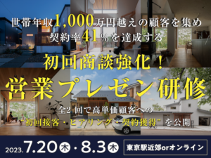 平均契約率41%を超えるためには。コンセプトが盛り込まれた建物と顧客の想像を超えるプランプレゼンが必要になってきます。実際のヒアリングからプレゼンまでの実研修を通じて、営業、設計のための伝える技術を包括したプレゼン手法を公開。ご提案技術を学び、お客様の意思決定を促す営業力を磨きます。