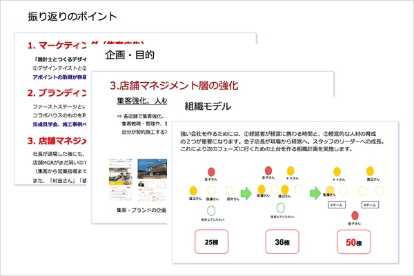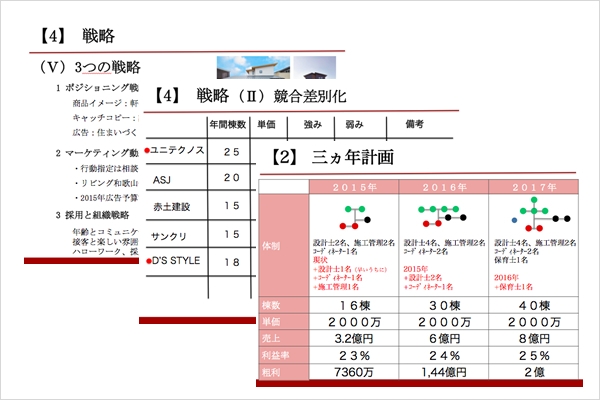 ヒアリングに基づき、1社1社オリジナルの経営コンサルティングサービスを企画させていただきます。経営陣を含む3名以上の経営コンサルタントの議論により戦略立案を行います。これまでの支援内容、および全国ビルダーの情報を集めた弊社独自の「ナレッジシステム」から分析を行い、各社の①目指す所(ビジョン)、②企業状況(商品・組織・経営資源)、③エリア市場環境に最適な戦略立案を行います。