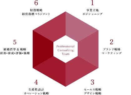 経営開発の土台には7つの経営指標マネジメントがあります。私たちは、事業立地戦略、マーケティング戦略、セールス&デザイン戦略、チーム組織戦略、財務会計戦略など、独自の強みを持つチームコンサルティングによって、優れた経営を、共に目指していきます。